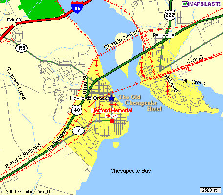 - Take Exit 89 "Havre de Grace" to end of ramp and make a right onto rt. 155 East. Proceed approximately 2 miles (to end of road). Make right onto Juniata St. Continue 2 blocks, make left at light onto Otsego Street. Proceed to end (the Susquehanna River will be straight ahead!) Make right onto North Union Avenue. The Old Chesapeake Hotel will be on your right two blocks north. Check-in for the Suites is at the restaurant. Park next to the restaurant at corner of Union and Franklin Streets.