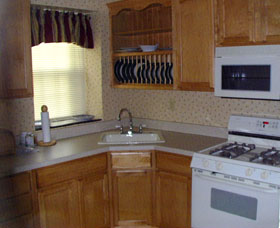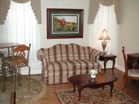This suite on the first floor is decorated with hunting scenes and has a queen-sized bedroom, full kitchen, living room and full bath. Complimentary cable television and high speed internet access are included.